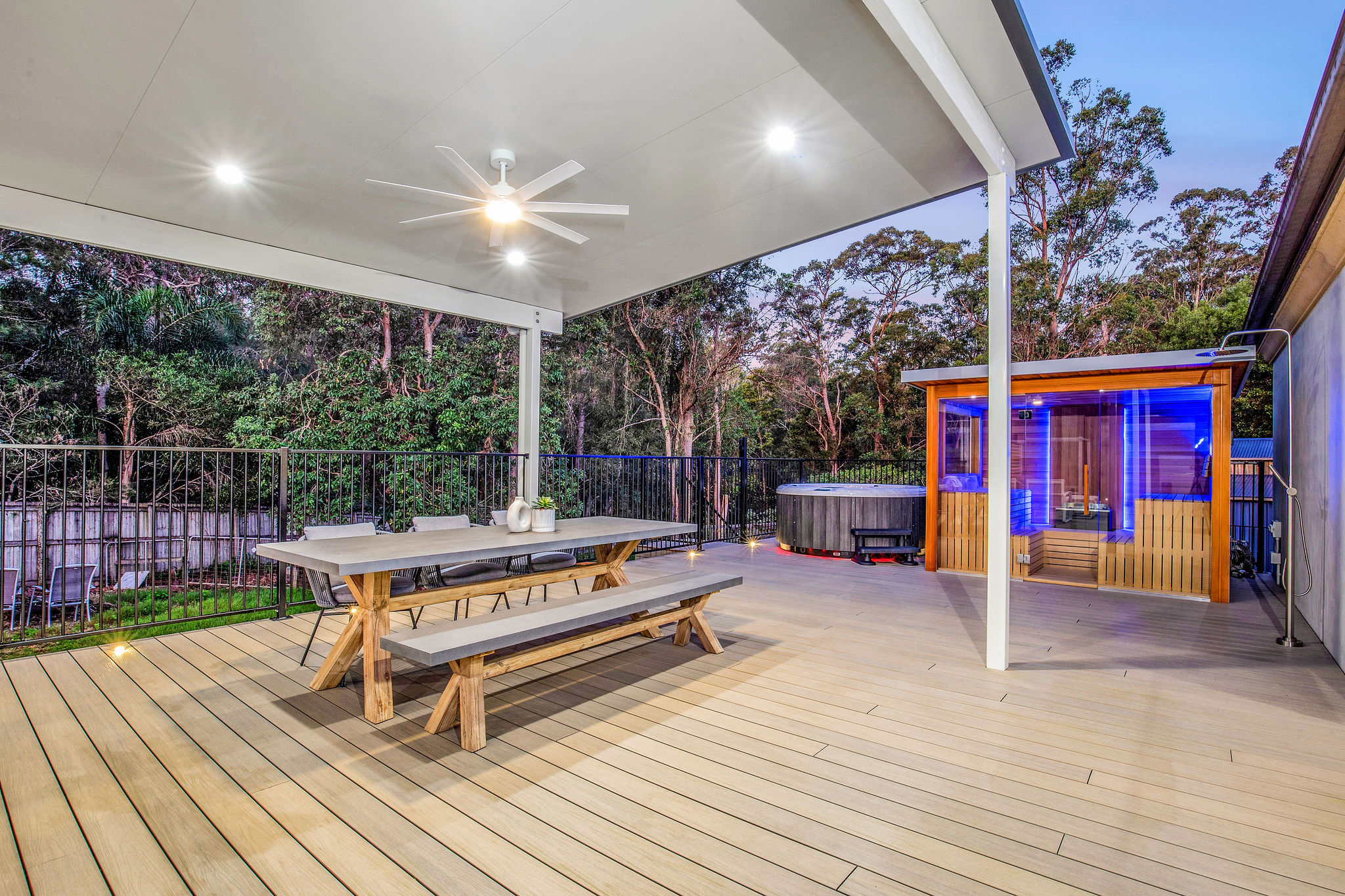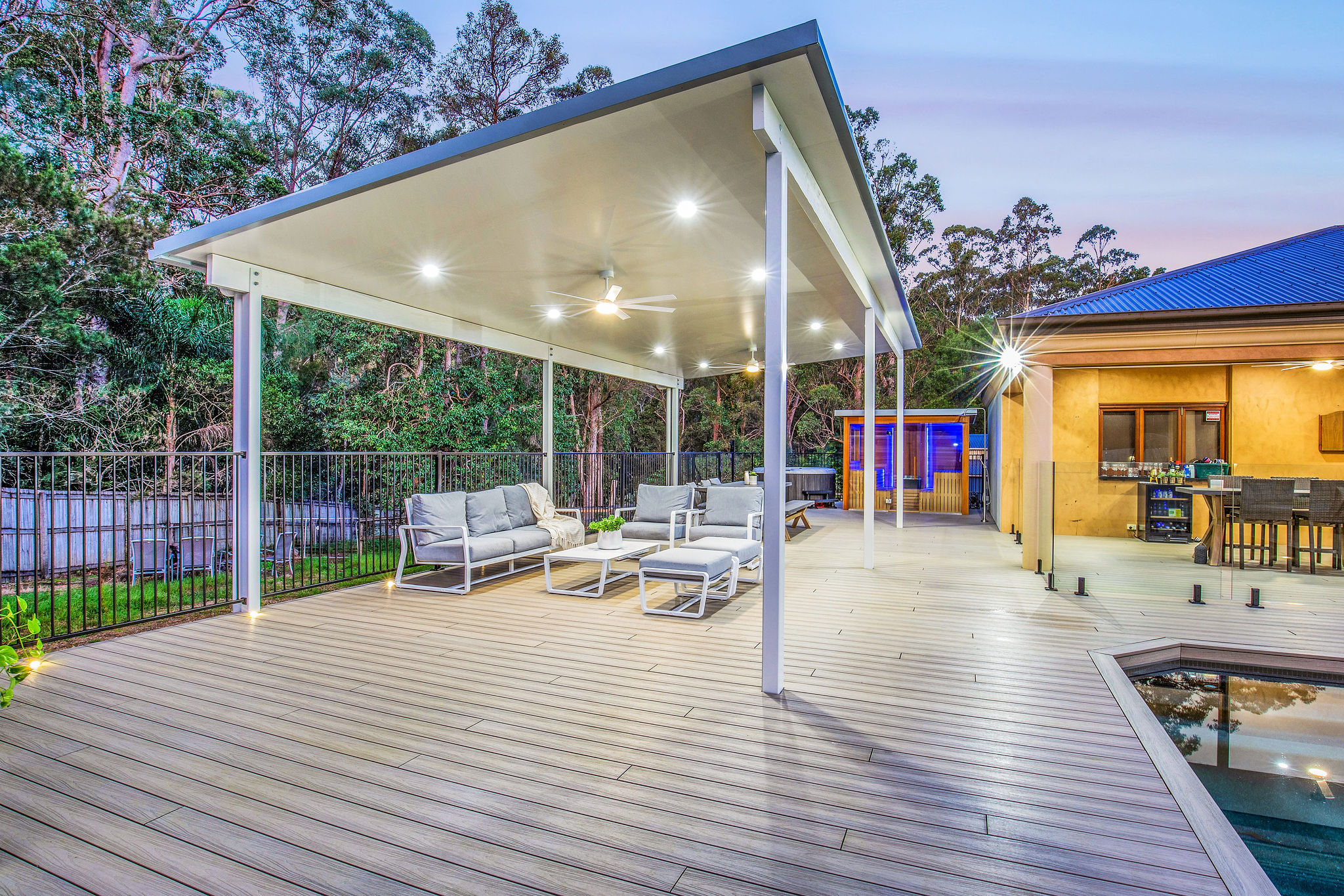 The Lawnhill project, client’s brief was to create a modern look, all one level and minimal maintenance. We demolished the old timber deck and used a combination of H3 Timbers and Aluminium Joists over the existing pool surround for the subfloor structure, 300 square metres of EKODECK ‘Backbeach’, powder coated steel posts and AUSDECK roofing for a crisp clean finish in the Alfresco area
