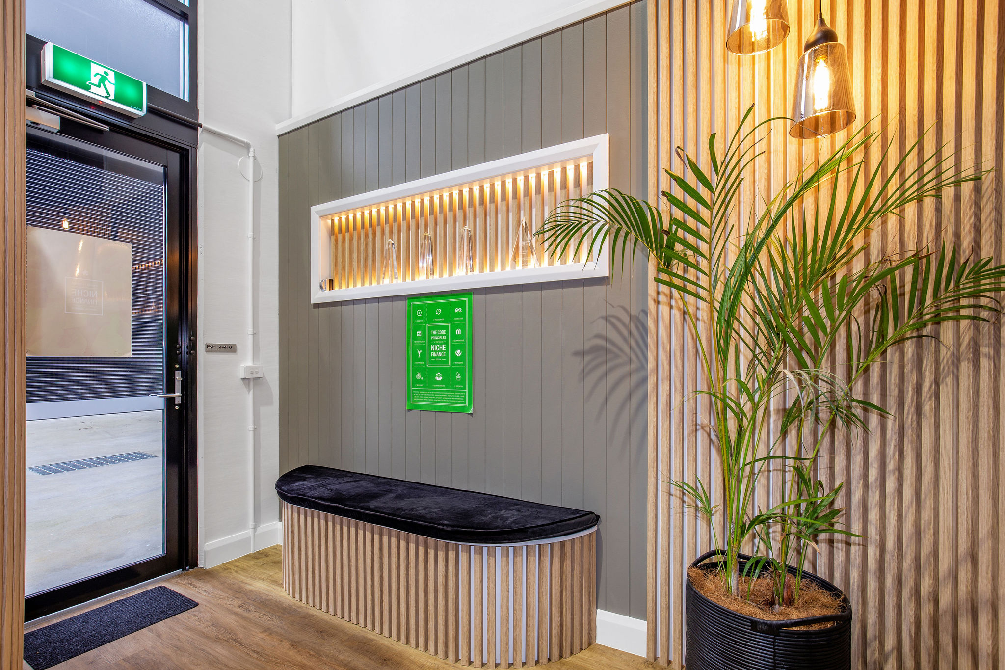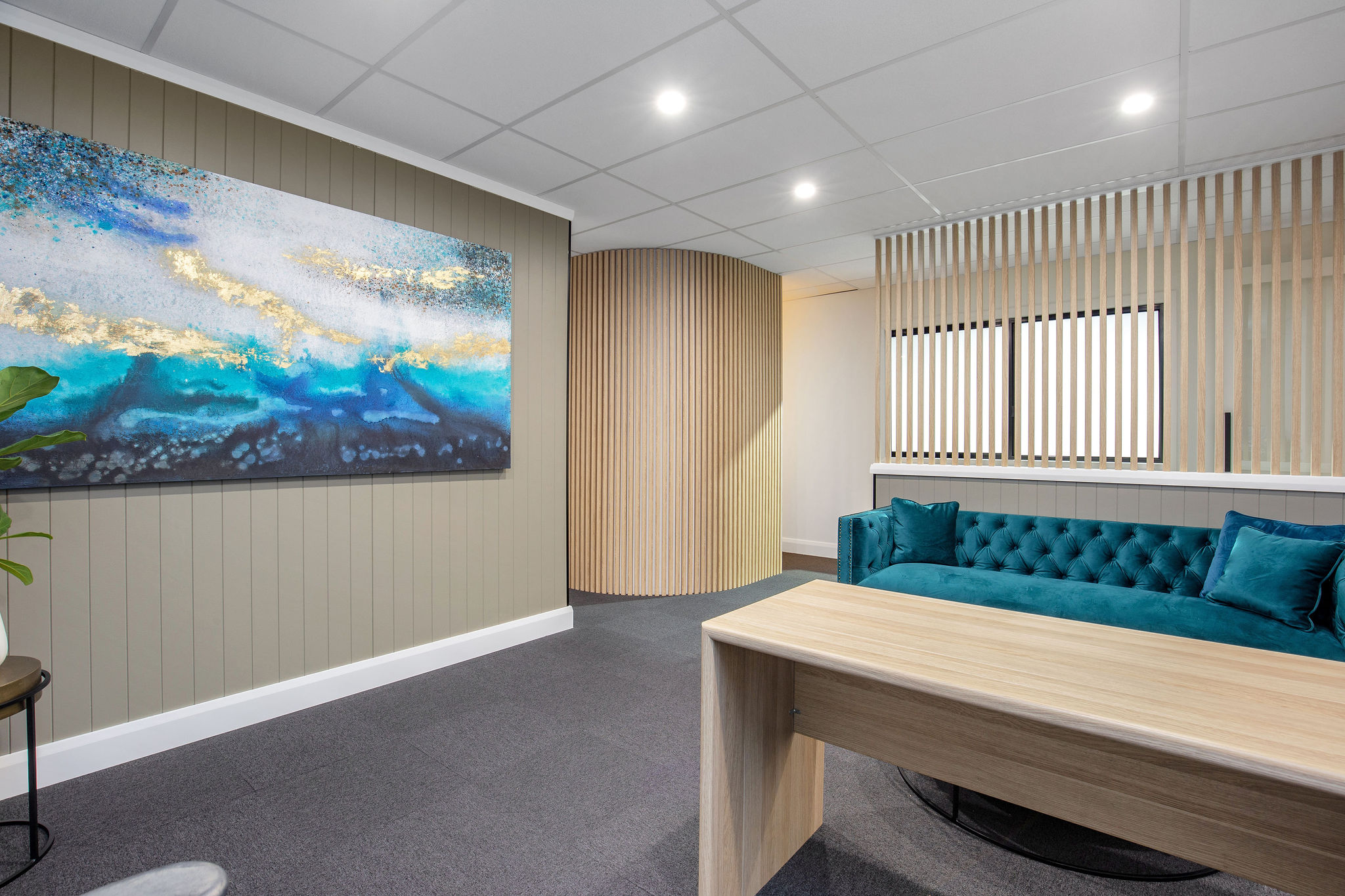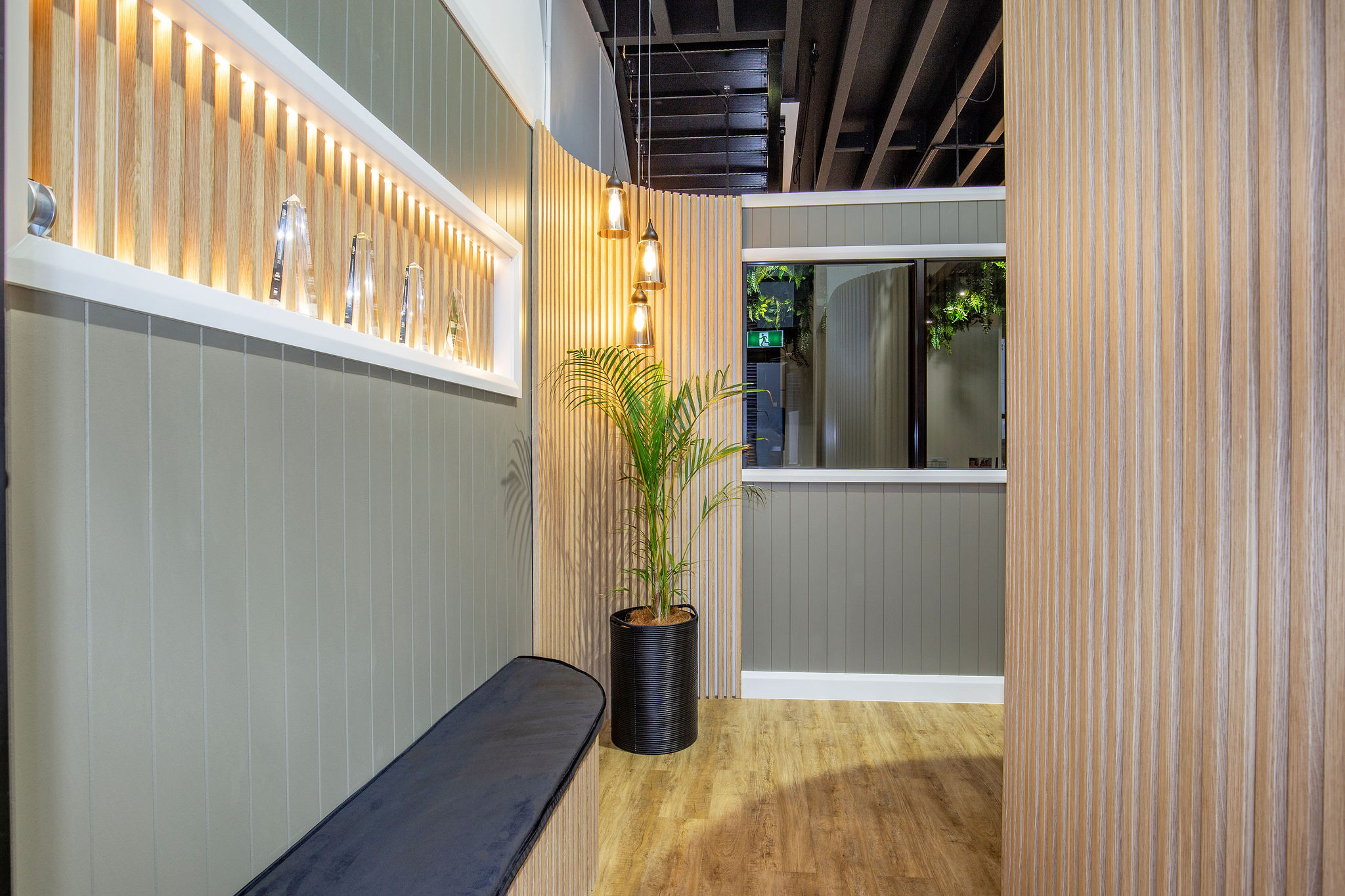 Working with the team at Living Happens, GBC was engaged to Fitout this newly procured warehouse, corporate office. The concept was to create a tranquil, calming and aesthetically pleasing space for Niche Finance’s director, their staff and for Niche clients to be welcomed into. This unique space consists of multiple curved walls battened using Polytec, Stecca wood, Natural Oak finish. VJ Paneling adding texture and warmth with the enhancement of stunning, pendant feature lighting throughout. Timber hanging planters were designed and built by GBC to cater for the overhead flora, adding colour and dimension to an otherwise unusable ceiling void.