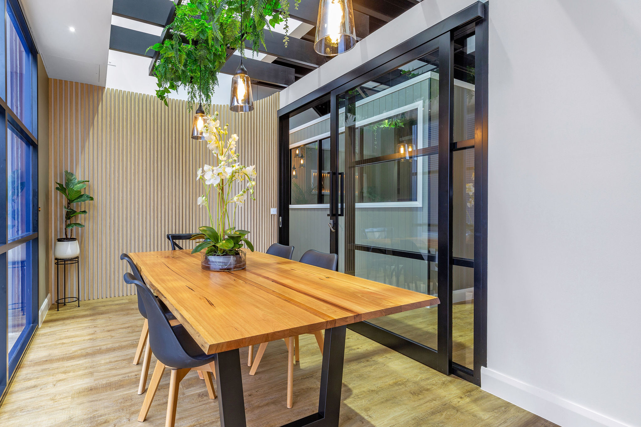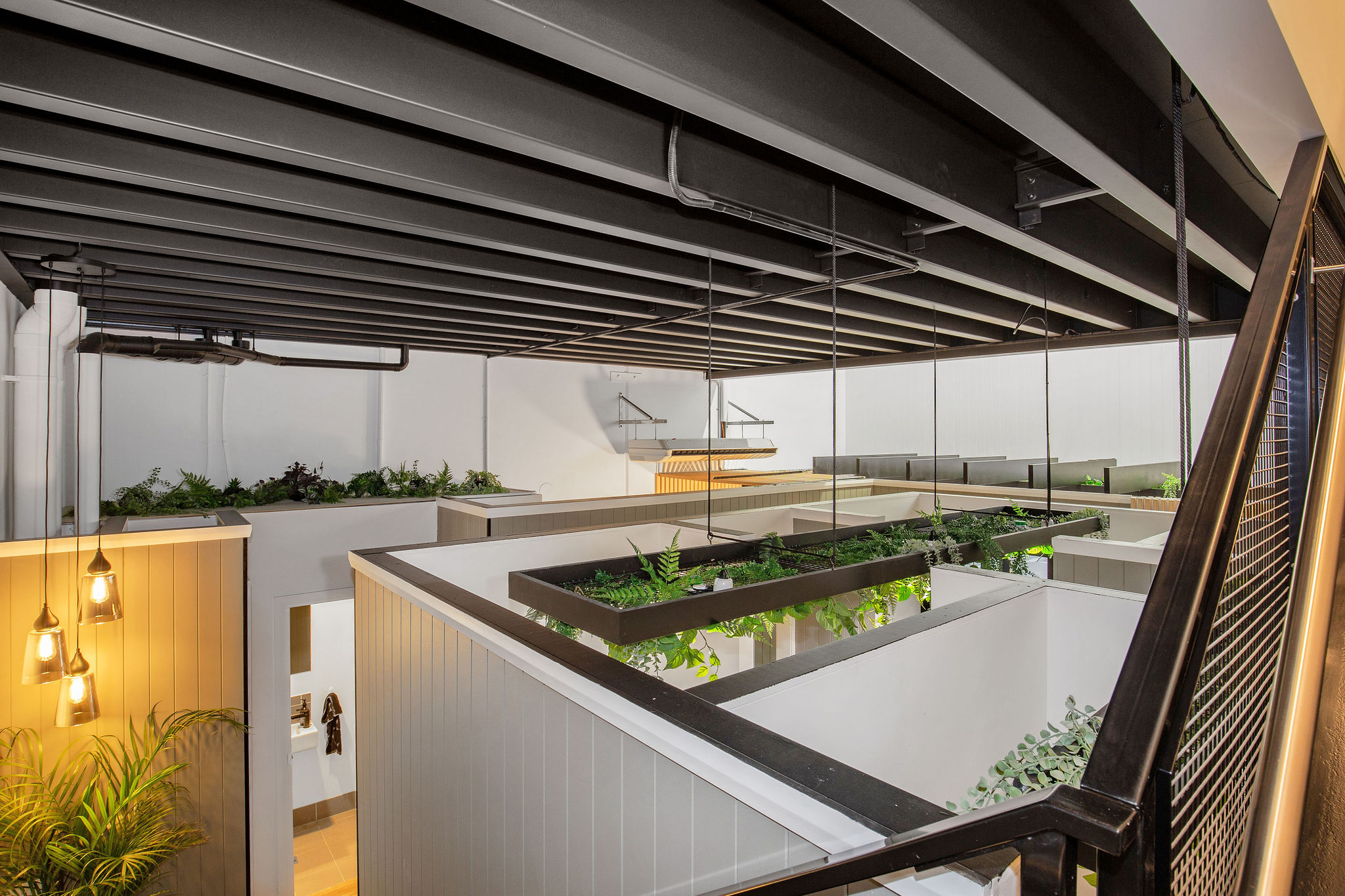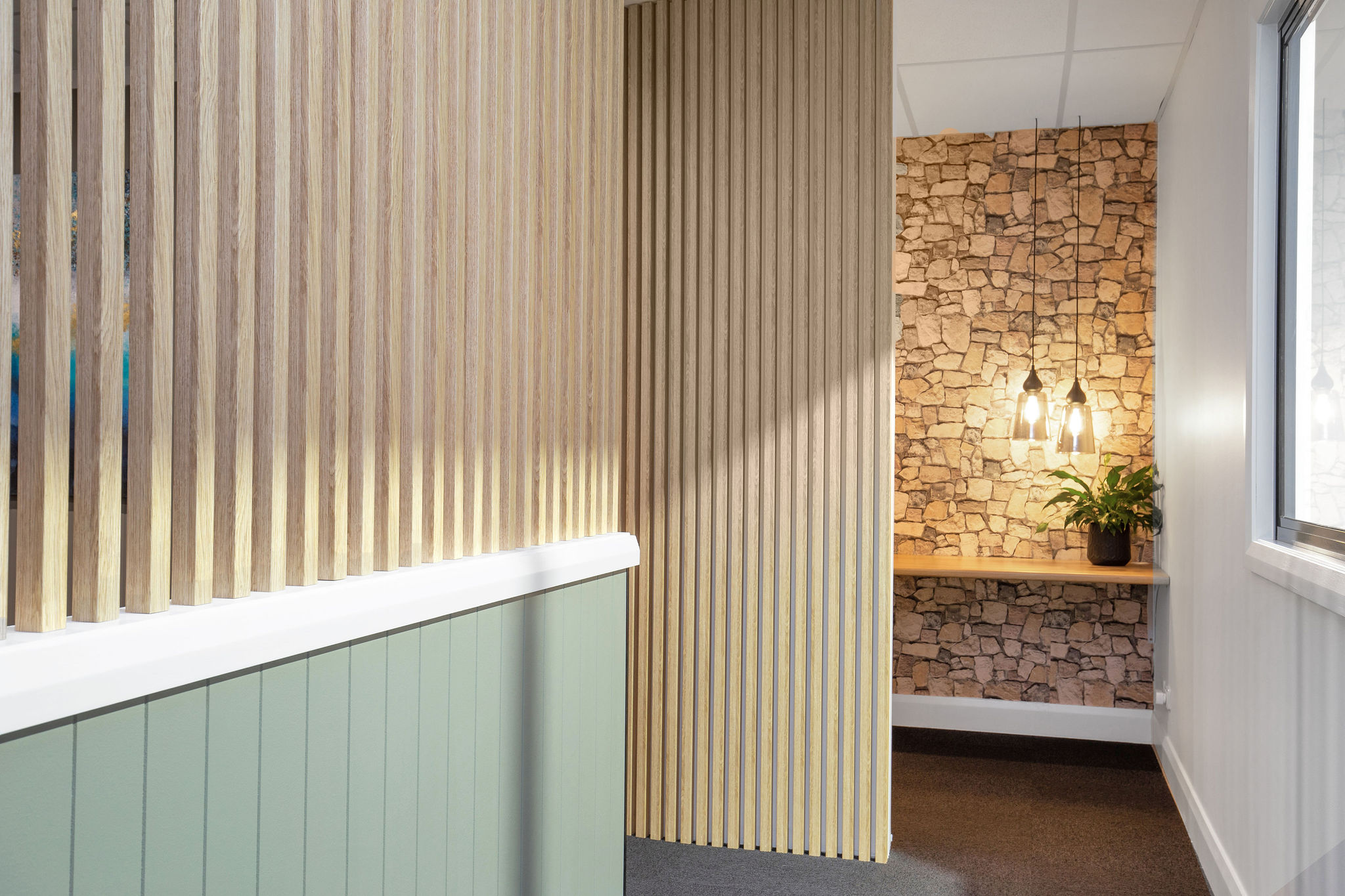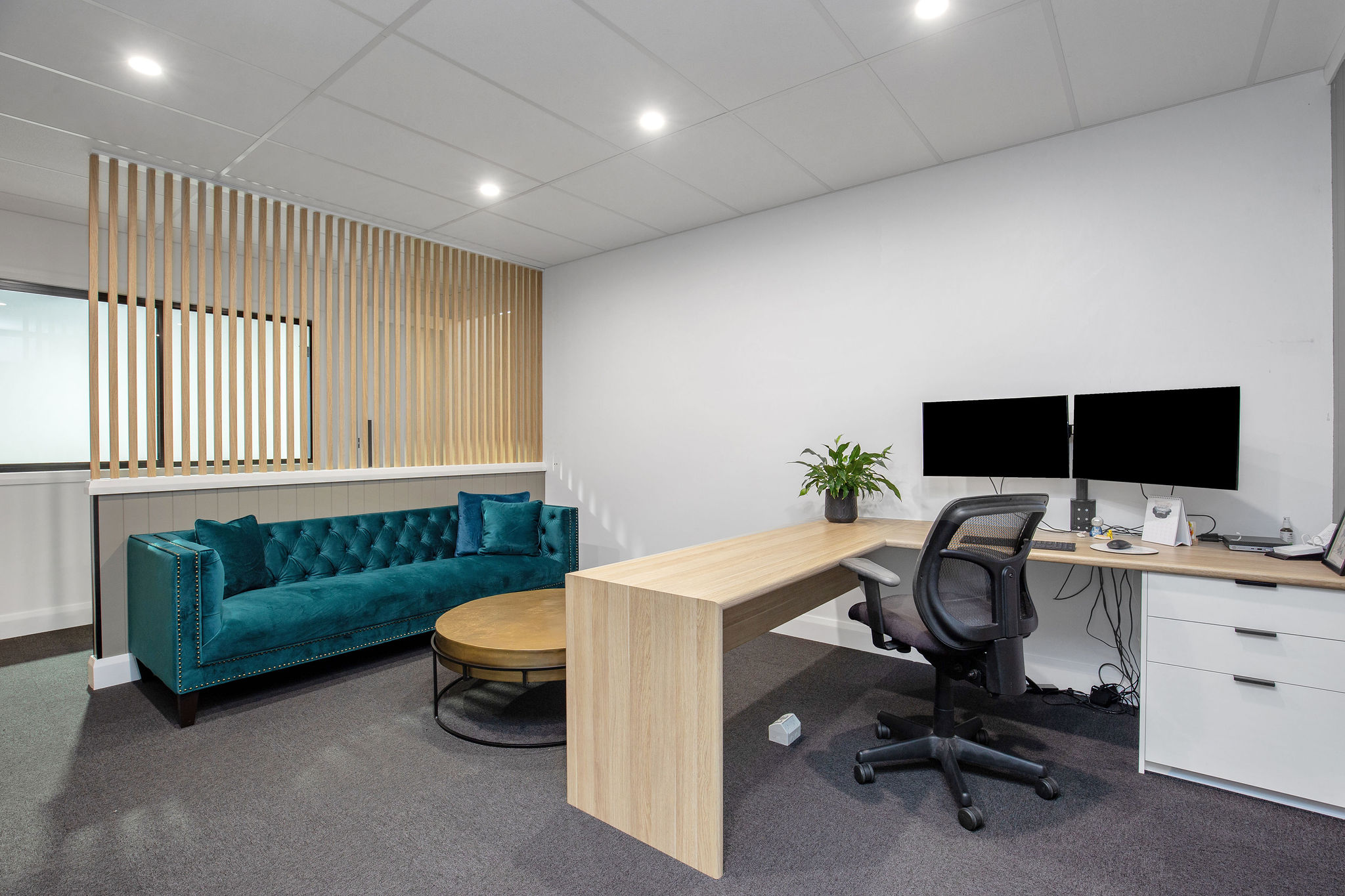 Working with the team at Living Happens, GBC was engaged to Fitout this newly procured warehouse, corporate office. The concept was to create a tranquil, calming and aesthetically pleasing space for Niche Finance’s director, their staff and for Niche clients to be welcomed into. This unique space consists of multiple curved walls battened using Polytec, Stecca wood, Natural Oak finish. VJ Paneling adding texture and warmth with the enhancement of stunning, pendant feature lighting throughout. Timber hanging planters were designed and built by GBC to cater for the overhead flora, adding colour and dimension to an otherwise unusable ceiling void.