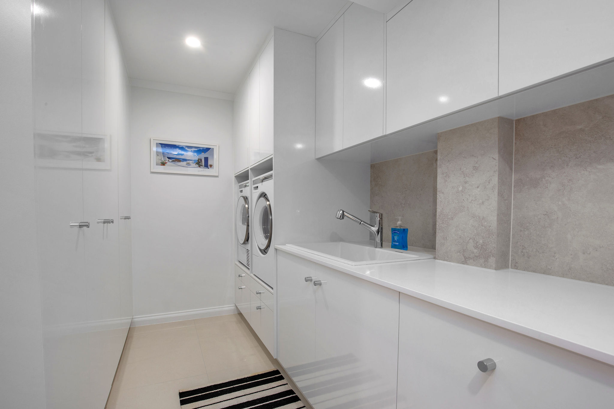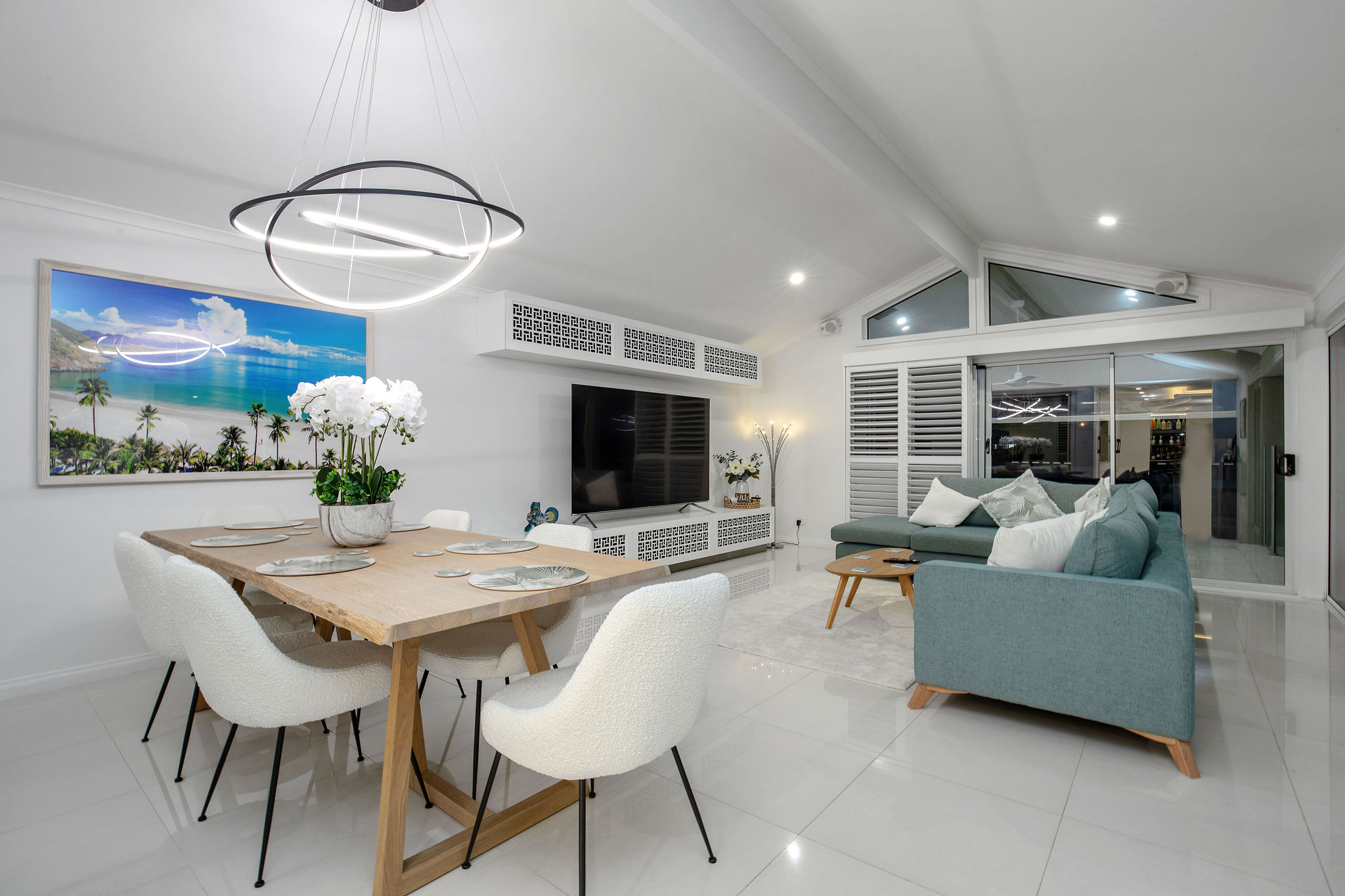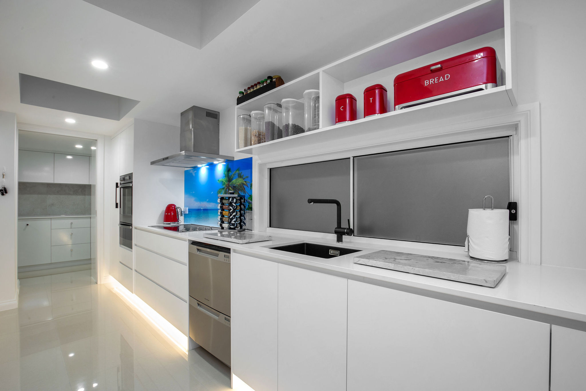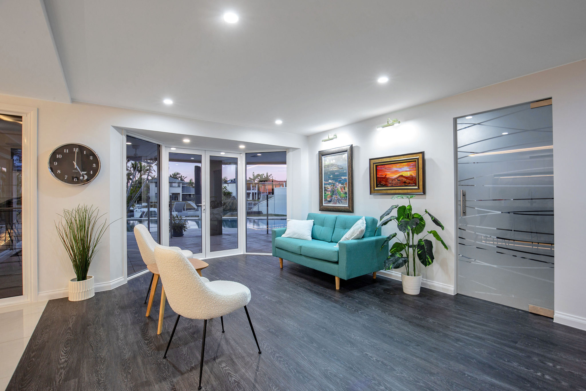 Transformation of a classic eighties-built house to a sophisticated, contemporary and functional open plan family home. The large kitchen area was relocated and completed with the addition of a large butlers kitchen which leads you to the laundry. Relocating the kitchen allows for a complete walk through from the front entry to the newly installed French, bay window style, doors which escort you to the outdoor areas and picturesque canal aspect.