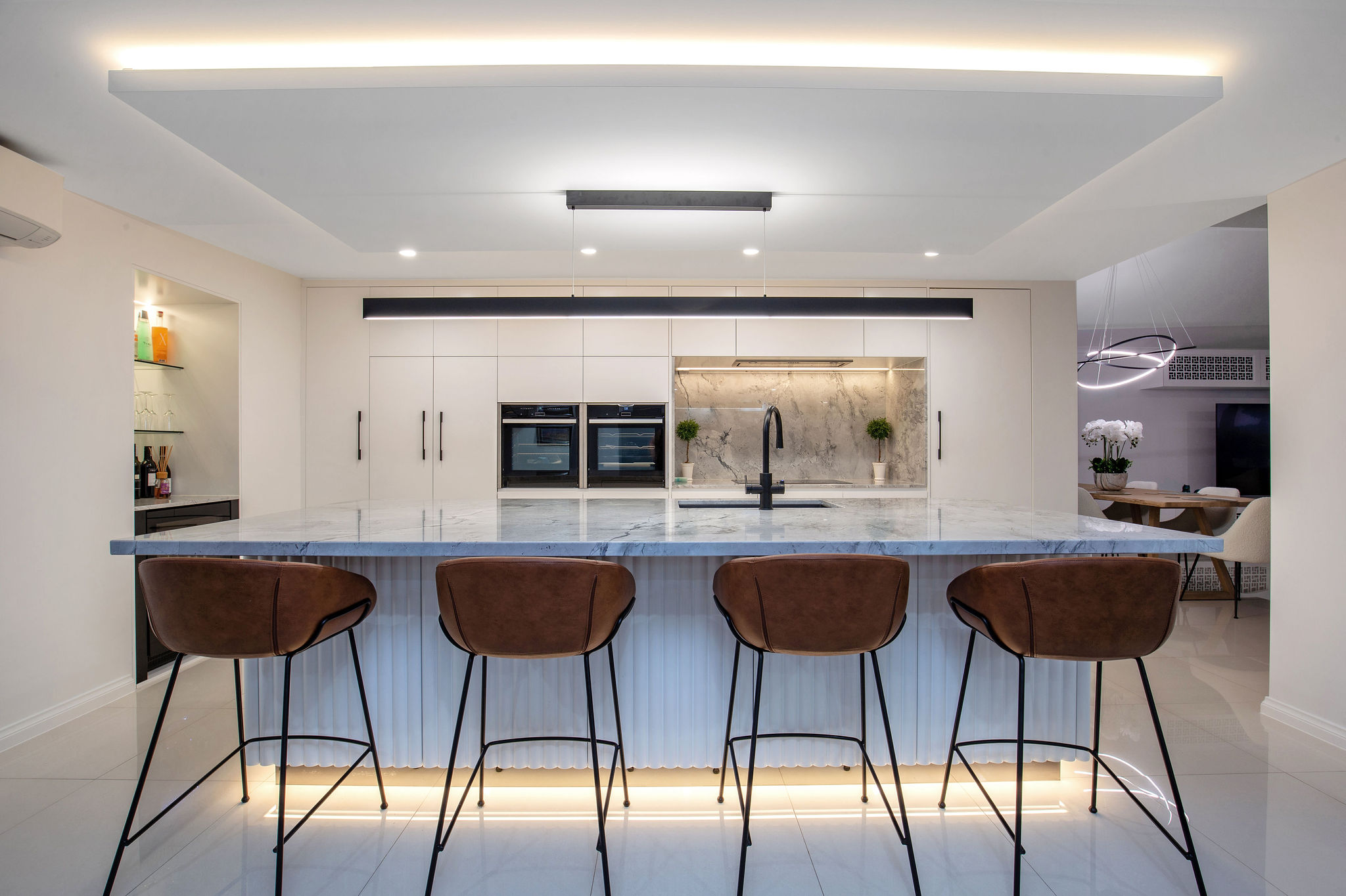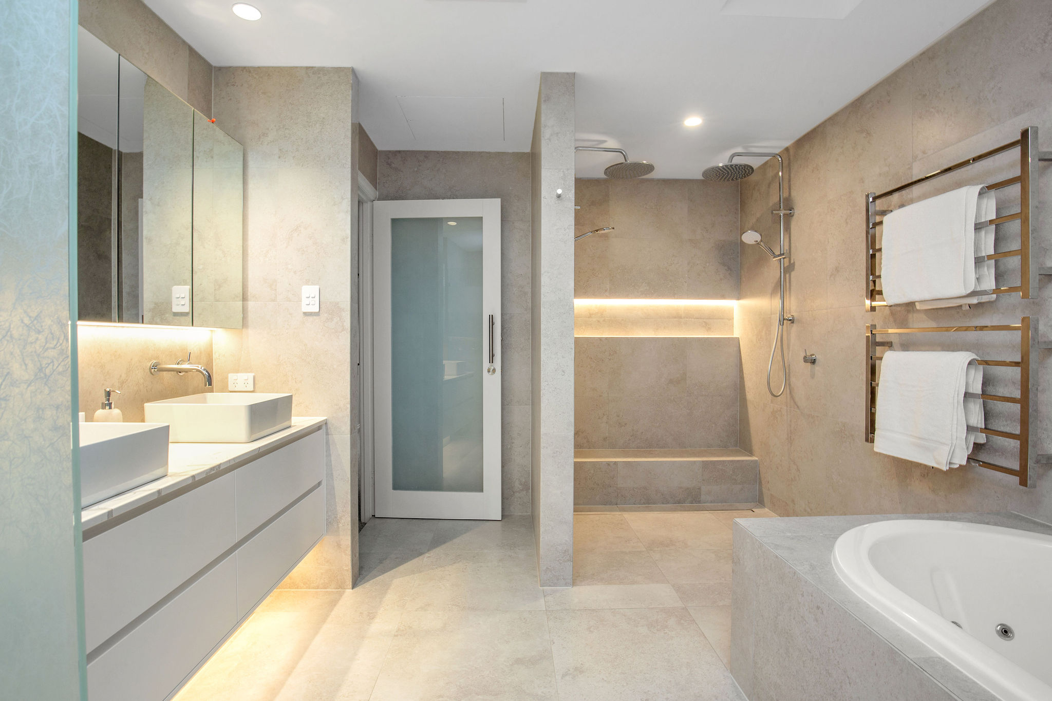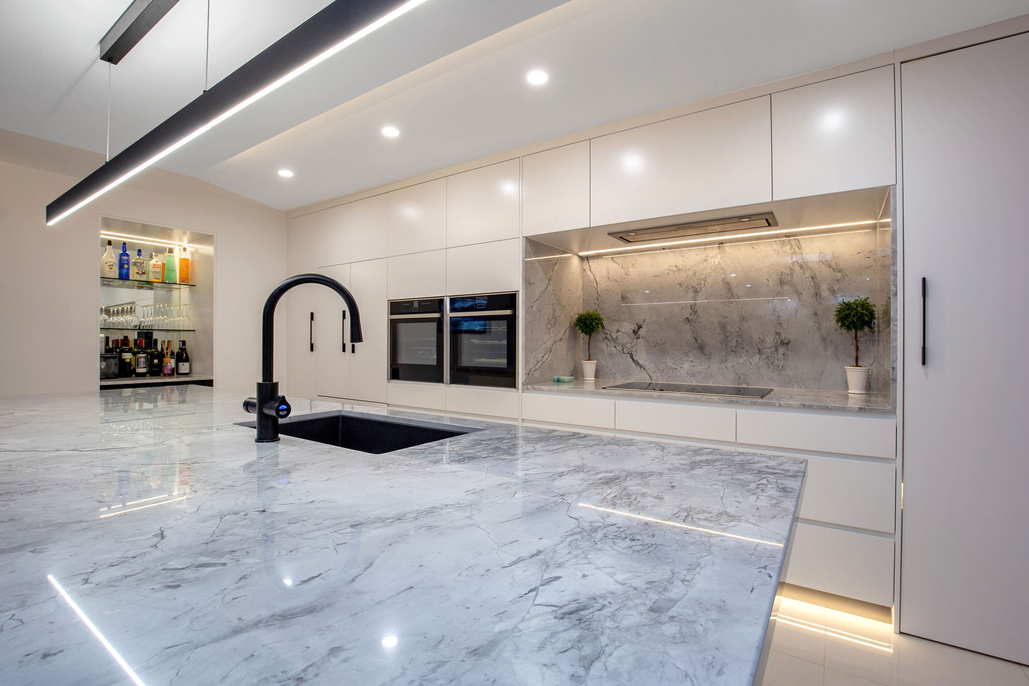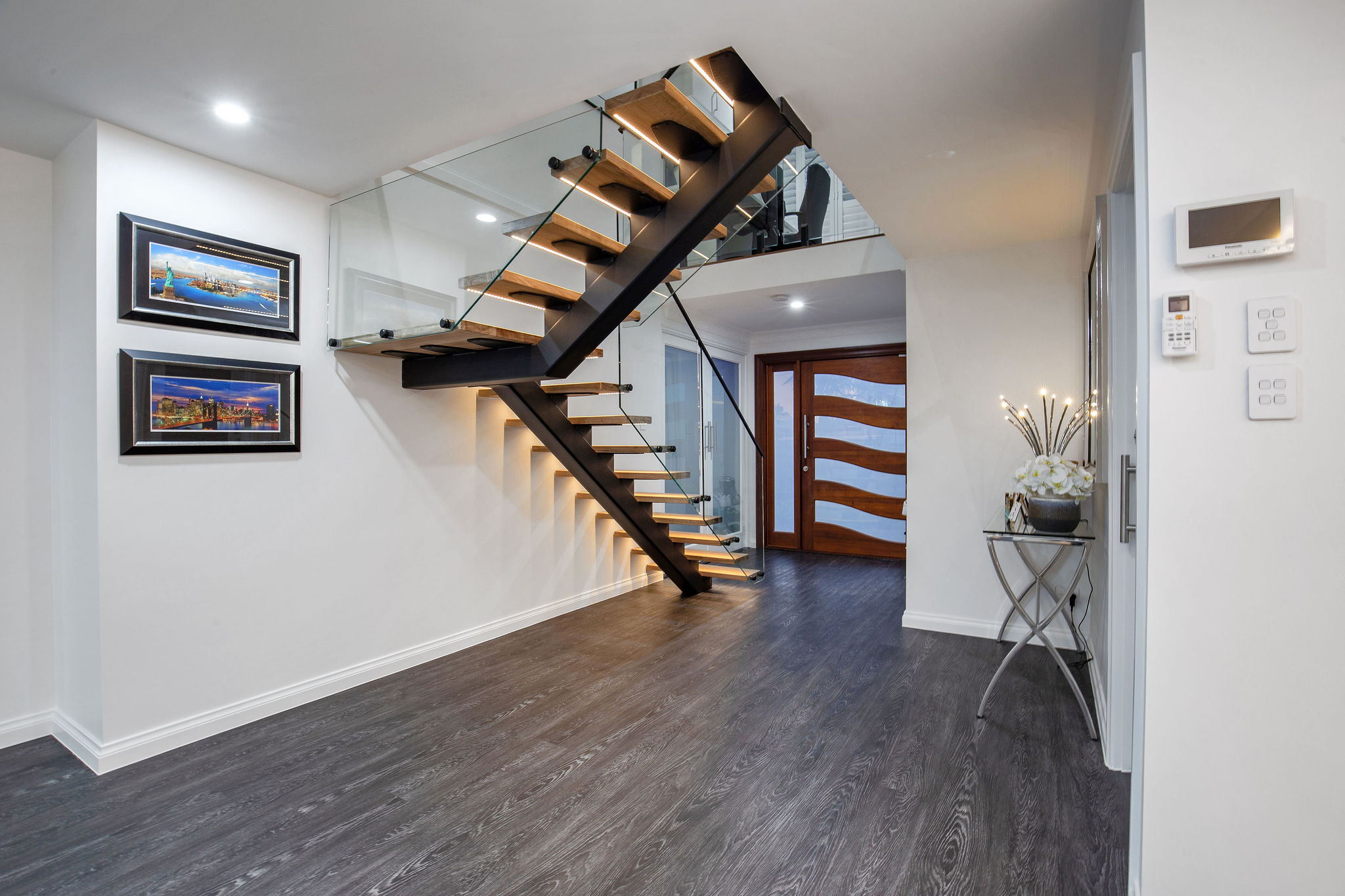 Lighting elements are featured throughout, including the Spotted Gum staircase treads, master ensuite and the kitchen bulkhead and kickboards.