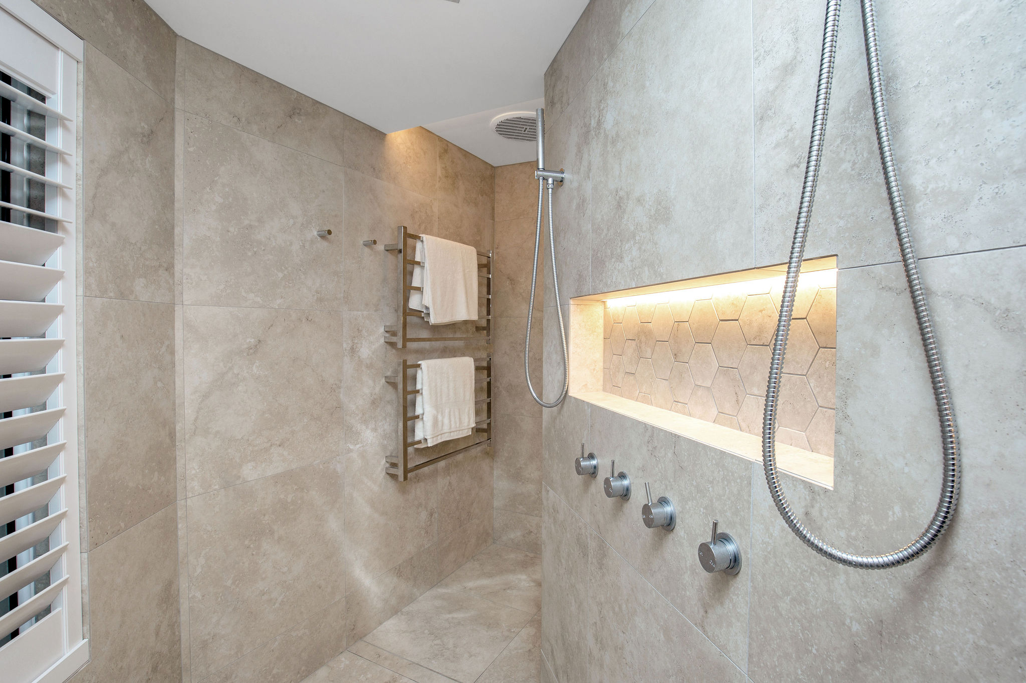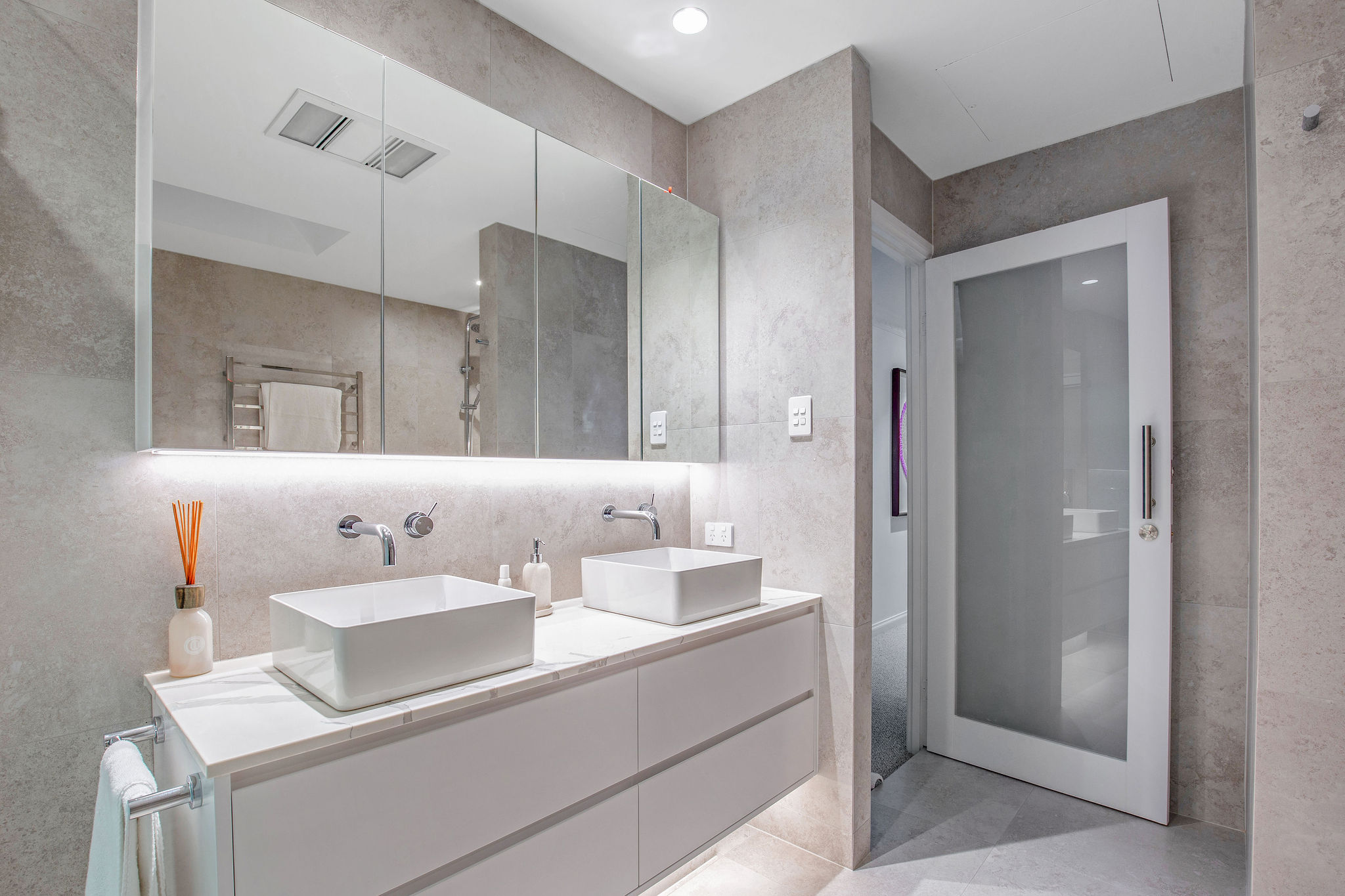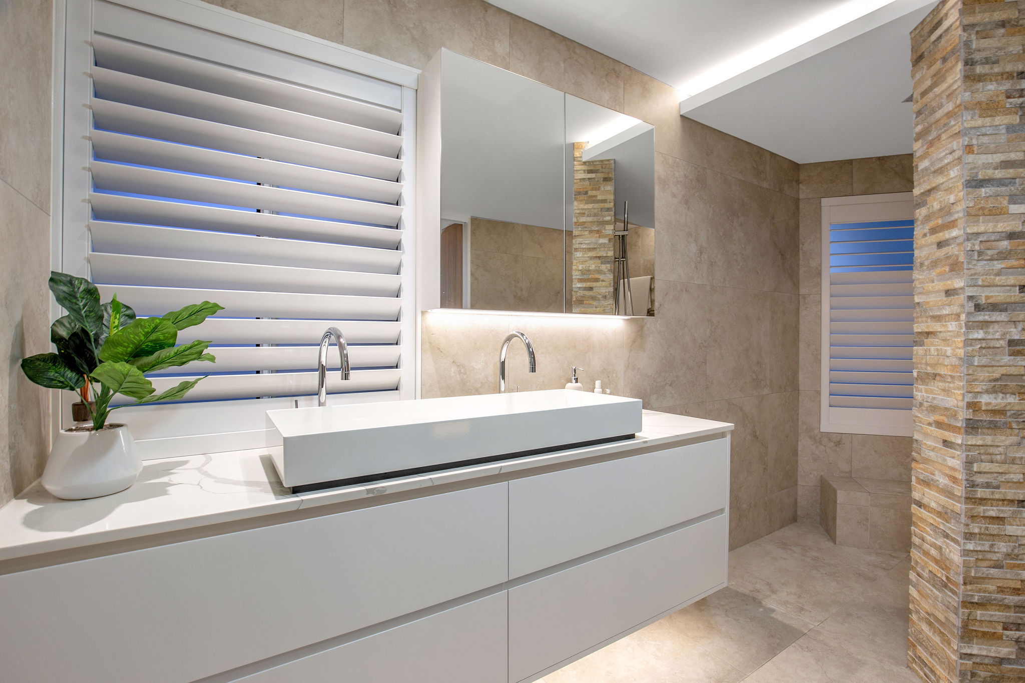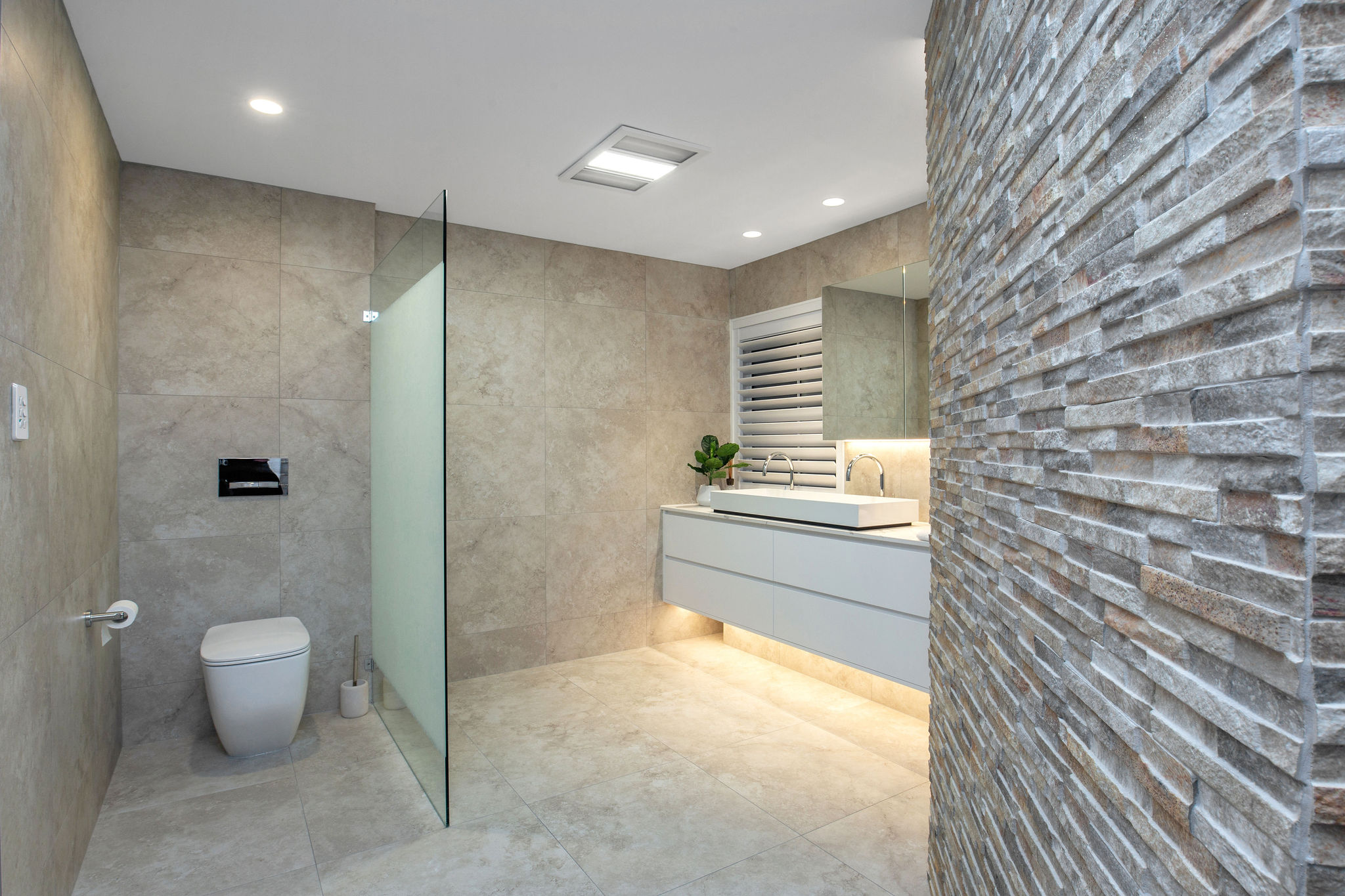Lighting elements are featured throughout, including the Spotted Gum staircase treads, master ensuite and the kitchen bulkhead and kickboards.