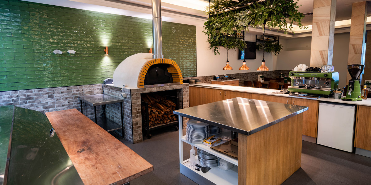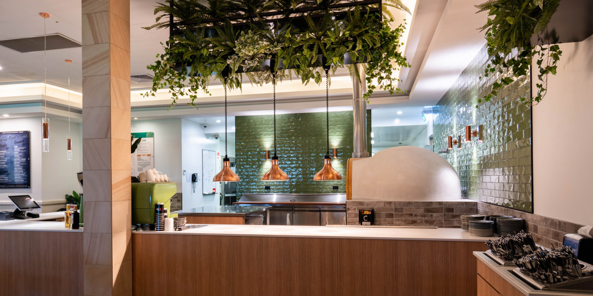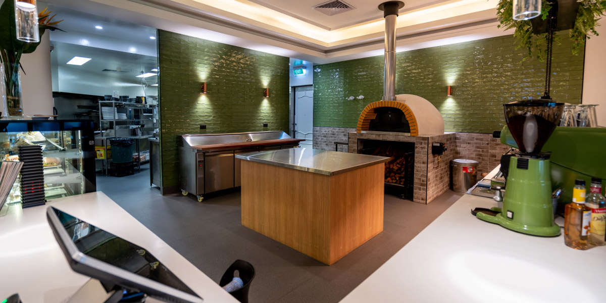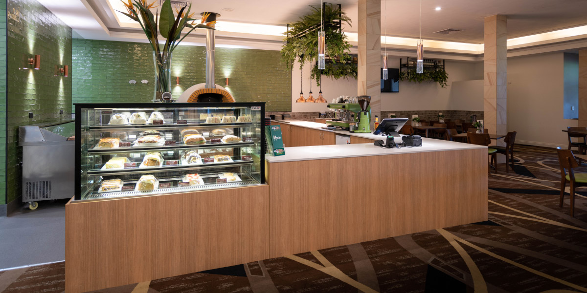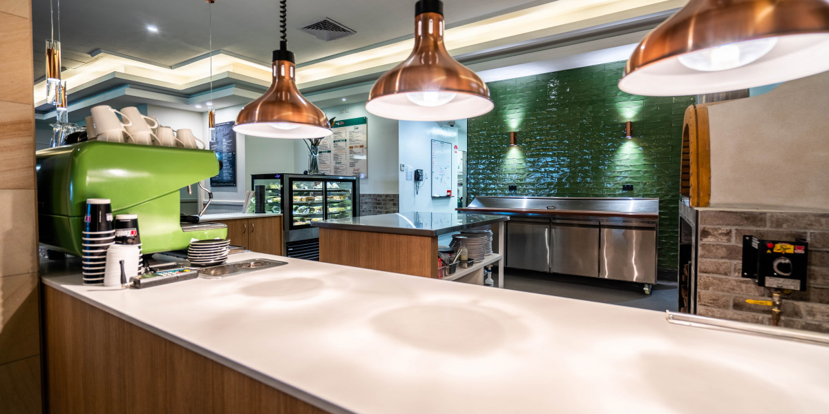 The existing kitchen and bistro were stripped out, overhead exhaust unit was removed, wall demolished and construction of a new wall was carried out. Communicating with the client and architectural designer to work through the finer details and the colour scheme to ensure the attention to detail of every aspect of the project. Safegaurd R12 slip resistant vinyl sheet flooring was laid throughout the kitchen and bistro, meeting safety and comfort standards. Stainless steel preparation fridges, bench tops, wall sheeting, servery pass, shelving and sink were integrated into the kitchen area, increasing functionality and efficiency. The bistro area was finished using premium quality Laminex, stone bench tops, feature tiling, which is softened with copper lighting fixtures. Finishing touches were added to enhance the appearance and ambiance of the dining area.